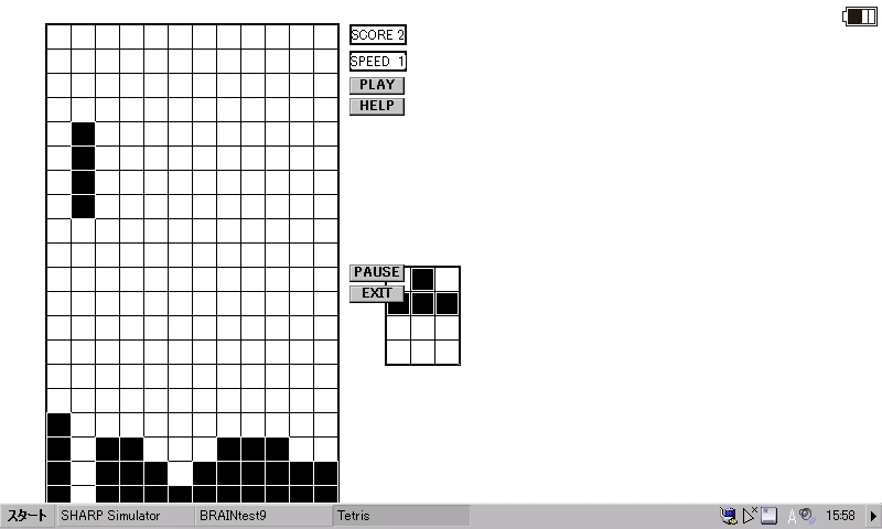 SOLYANIK 氏のものよりサウンドが充実し、ゲーム自体もカラー化されています。ゲームオーバーの演出も追加され、より凝った設計になっています。さらに、パターンも固定ではなく毎回変化します。ただし、サウンド部分が Brain の貧弱な CPU にはしんどいらしく、SOLYANIK 氏のものより重くなっています。それゆえ上部のメニューバーの描画が飛んだりしますが、操作に支障はありません。