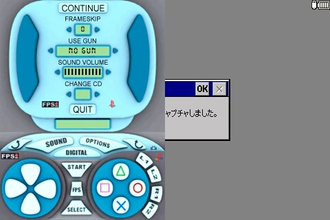さて、画面に目をやると、画面下半分はキーパッドに割り当てられています。その中の「OPTIONS」をタップすると、描画と音声の設定ができます。ただ、フレームスキップについてはスキップしても別に速くなるわけではないので、切っておいたほうがなめらかに動きます。また、「メタルギア ソリッド」などのように、複数枚の CD にまたがってゲームデータが記録されているゲームについては、「CHANGE CD」の項目で対応しています。キーパッドですが、基本的にはどれを触っても問題はないのですが、「DIGITAL」に触るとフリーズするので、注意してください。