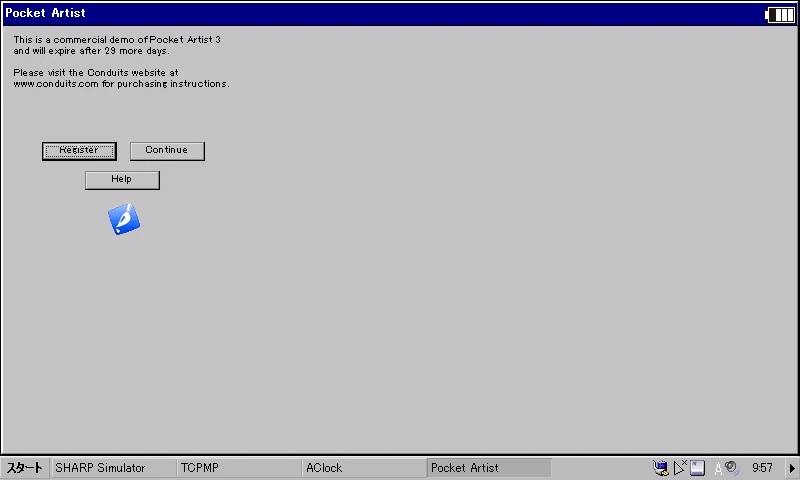 真っ先に「オーナーの設定をしてください」という趣旨のダイアログが出ますが、決定ボタンを押すなりして次に進みます。次に、これはデモ版ですから「製品版を購入してください」という趣旨のメッセージが起動するたびに表示されますが、「Continue」を選択して次に進みます。「画像ファイルを Pocket Artist で開くようにしますか?」という趣旨のメッセージが出た場合は、希望通りの選択肢を選びます。以上で起動します。