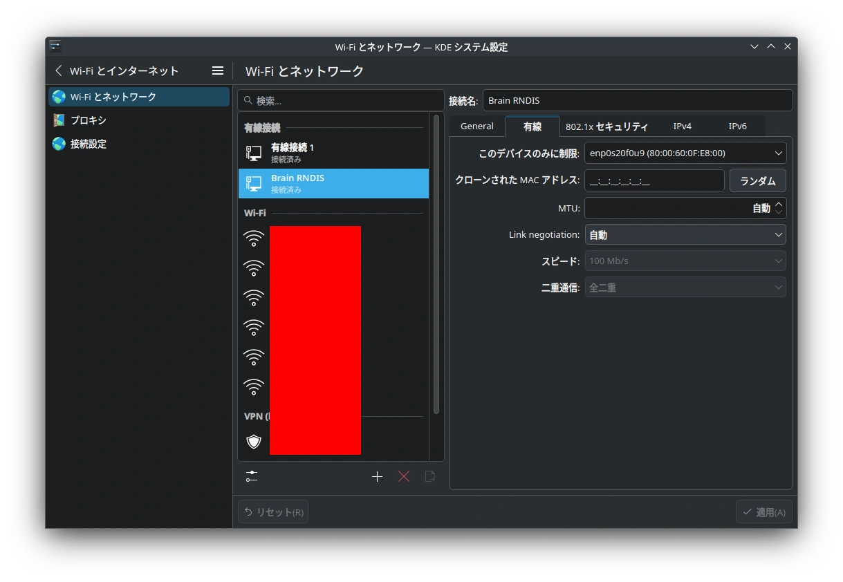 KDE の場合、KDE システム設定の「Wi-Fi とネットワーク」を開き、「新しい接続を追加」から「有線接続(共有)」を「作成」します。「有線」タブで「このデバイスのみに制限」から Brain のインタフェースを指定し、「General」タブで「この優先度で自動的に接続」にチェックを入れ、「保存」を押します。母艦が有線 LAN でインターネットに接続している場合は、対応する(元からある)有線接続の「有線」タブの「このデバイスのみに制限」に有線 LAN のインタフェースを指定しておきます。すると Brain がインターネットに疎通し、Opera Mini などが使えるようになるはずです。